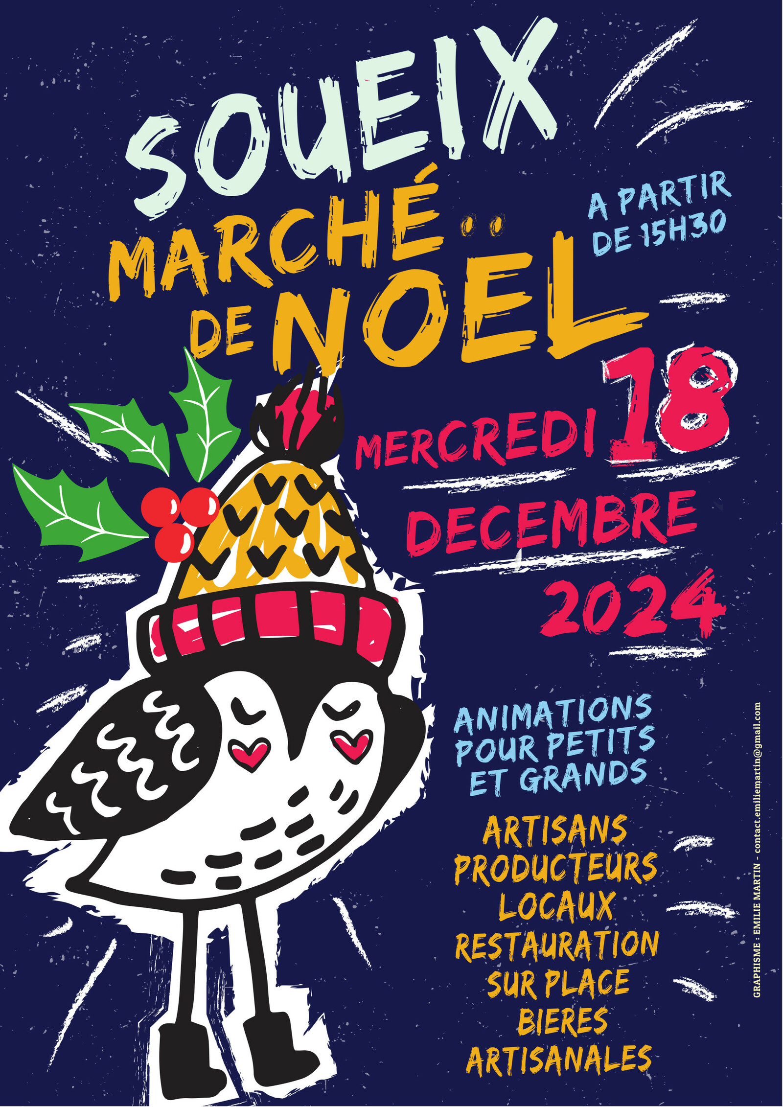 Venez rencontrer les artisans et producteurs du petit marché de Soueix à l'occasion de leur marché de Noël qui se tiendra mercredi 17 décembre à partir de 15h30 sur la place du village. En prime, de nombreuses animations et de la musique tout au long de l'évènement. Ils vous attendent nombreux !